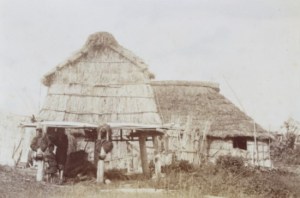 Gelatin silver print photograph of traditional Ainu storehouse, with child in traditional costume visible at lower left corner, c. 1890s.