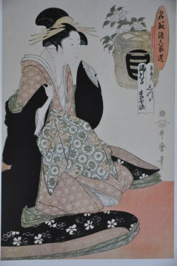 One of a series of prints featuring famous courtesans with famous sake. 1794.