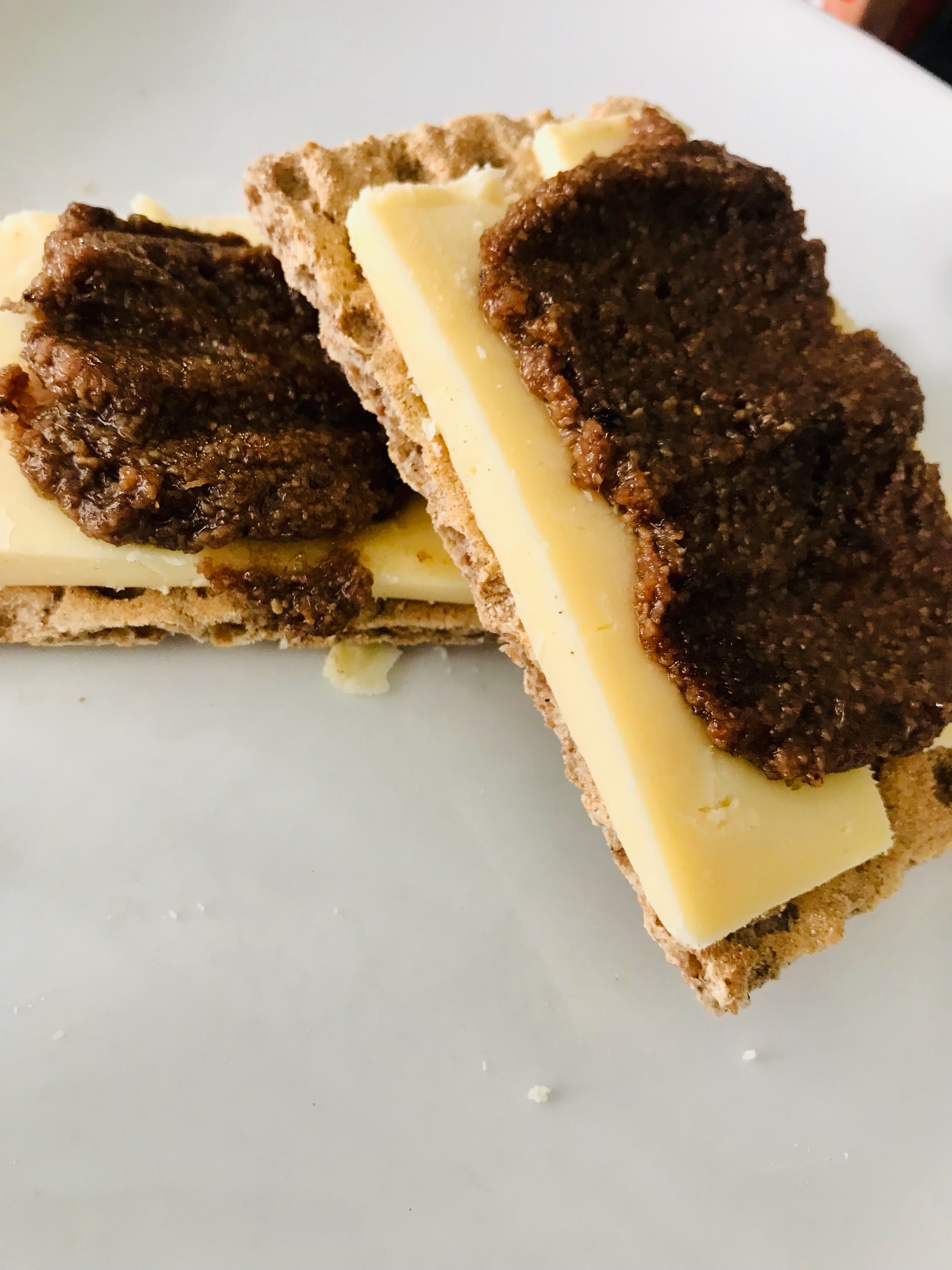 And with the cheese on rye crispbreads: This was nice in that the cheddar brought out the tartness, but I think the other recipes using it as an accompaniment to venison or bacon would be a slightly better combination. Also steak.